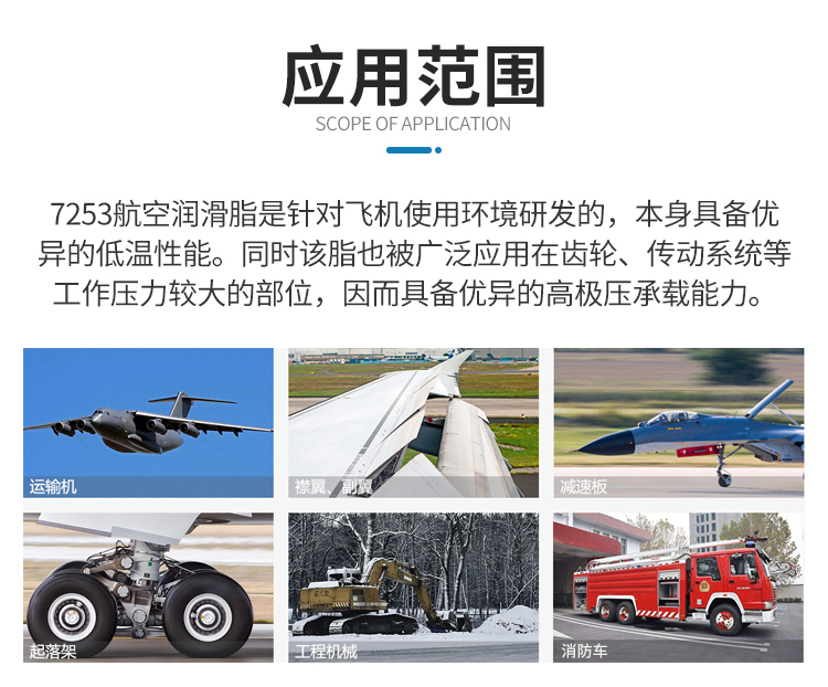 7253航空潤滑脂是我國軍方及國產飛機廣泛使用的潤滑產品,取代了80年代以前使用的7008、7008-1及7012航空潤滑脂,其低溫性能達到了極低溫至-73℃,耐長期高溫至121℃,達到業界先進水平。
